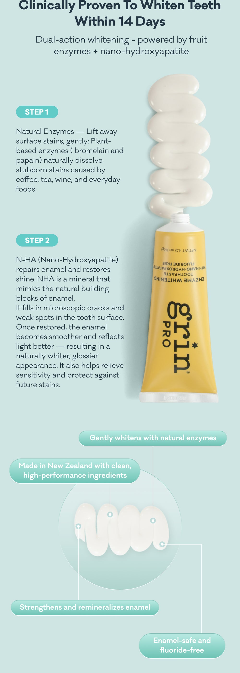 Bromelain and Papain work together to disrupt the protein structures within plaque, to break down extrinsic stains from the tooth surface - leaving you with a whiter, brighter smile! While nano-hydroxyapatite (n-HA) which works to strengthen and remineralise your enamel to reduce sensitivity. N-HA also forms a protective barrier on the enamel, making it smoother, brighter and more resistant to acid attacks!
