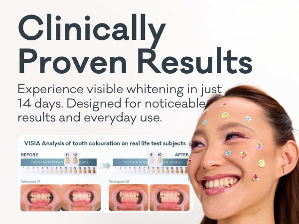 Our dual-action formula utilises a high concentration of fruit enzymes (bromelain and papain) to naturally dissolve stubborn stains caused by coffee, tea, wine, and everyday foods. In combination with Nano-Hydroxyapatite, a mineral that mimics the natural building blocks of enamel.